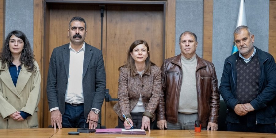 Diyarbakır Büyükşehir Belediyesi ile SS Öz Diyarbakır Özel Halk Otobüsleri ve SS 53 Nolu Özel Halk Otobüsleri kooperatifleri kent içi toplu taşıma hizmetlerinin daha etkin ve düzenli yürütülmesini amaçlayan bir protokol imzalandı. Çand Amed Kültür ve Kongre Merkezi’ndeki imza törenine, Diyarbakır Büyükşehir Belediyesi Eşbaşkanları Serra Bucak ve Doğan Hatun ile SS Öz Diyarbakır Özel Halk Otobüsleri Başkanı Fesih Kaya ve SS 53 Nolu Özel Halk Otobüsleri Şehir içi Karayolu Yolcu Taşıma Kooperatifi Başkanı Mehmet Pervane katıldı.
