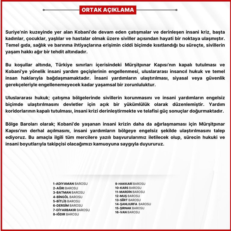 Bölge Baroları olarak; Kobani’de yaşanan insani krizin daha da ağırlaşmaması için Mürşitpınar Kapısı’nın derhal açılmasını, insani yardımların bölgeye engelsiz şekilde ulaştırılmasını talep ediyoruz. Bu amaçla ilgili tüm mercilere yazılı başvurularımız iletilecek olup, sürecin hukuki ve insani boyutlarıyla takipçisi olacağımızı kamuoyuna saygıyla duyururuz.”