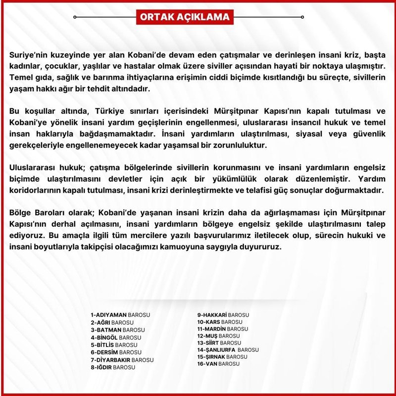 Bölge Baroları olarak; Kobani'de yaşanan insani krizin daha da ağırlaşmaması için Mürşitpınar Kapısı'nın derhal açılmasını, insani yardımların bölgeye engelsiz şekilde ulaştırılmasını talep ediyoruz. Bu amaçla ilgili tüm mercilere yazılı başvurularımız iletilecek olup, sürecin hukuki ve insani boyutlarıyla takipçisi olacağımızı kamuoyuna saygıyla duyururuz.”
